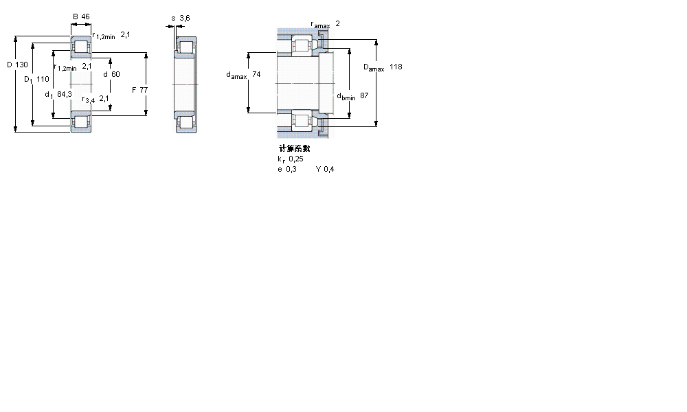 | 圓柱滾子軸承, 單列, NJ 設計, 于外圈的一個帶定位槽 | ||||||||||||